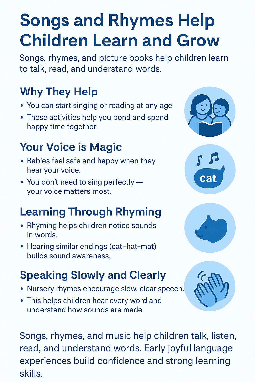Songs, rhymes, and musical activities are more than fun — they help children talk, listen, read, and understand words. By singing, playing rhyming games, and moving to music, parents can make learning exciting and joyful.